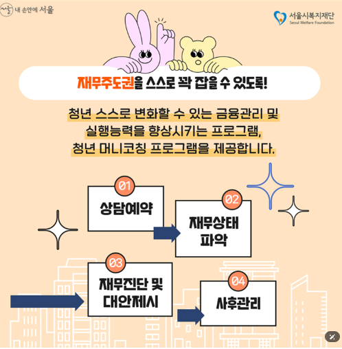 - 청년 맞춤형 금융 상담: 만 39세 이하 서울시 청년 누구나 무료로 1:1 심층 상담 가능해요.