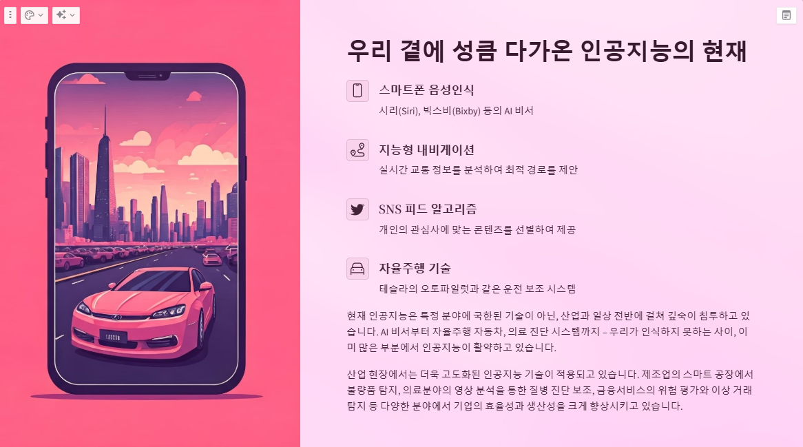 현재 인공지능은 특정 분야에 국한된 기술이 아닌, 산업과 일상 전반에 걸쳐 깊숙이 침투하고 있습니다. AI 비서부터 자율주행 자동차, 의료 진단 시스템까지 – 우리가 인식하지 못하는 사이, 이미 많은 부분에서 인공지능이 활약하고 있습니다.
