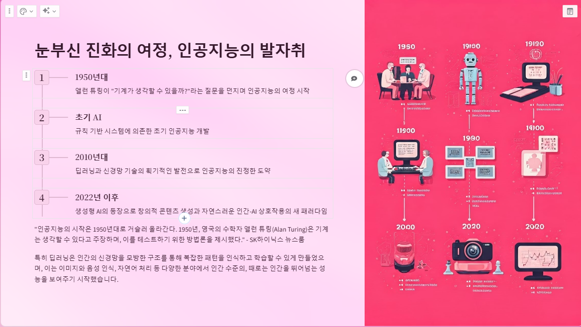 초기의 인공지능은 주로 규칙 기반 시스템에 의존했으나, 2010년대 들어 딥러닝과 신경망 기술의 획기적인 발전으로 인해 진정한 도약을 이루게 됩니다. 특히 2022년 이후 생성형 AI의 등장은 인공지능이 단순한 분석 도구가 아닌, 창의적인 콘텐츠를 생성하고 인간과 자연스럽게 상호작용할 수 있는 새로운 패러다임을 열었습니다.