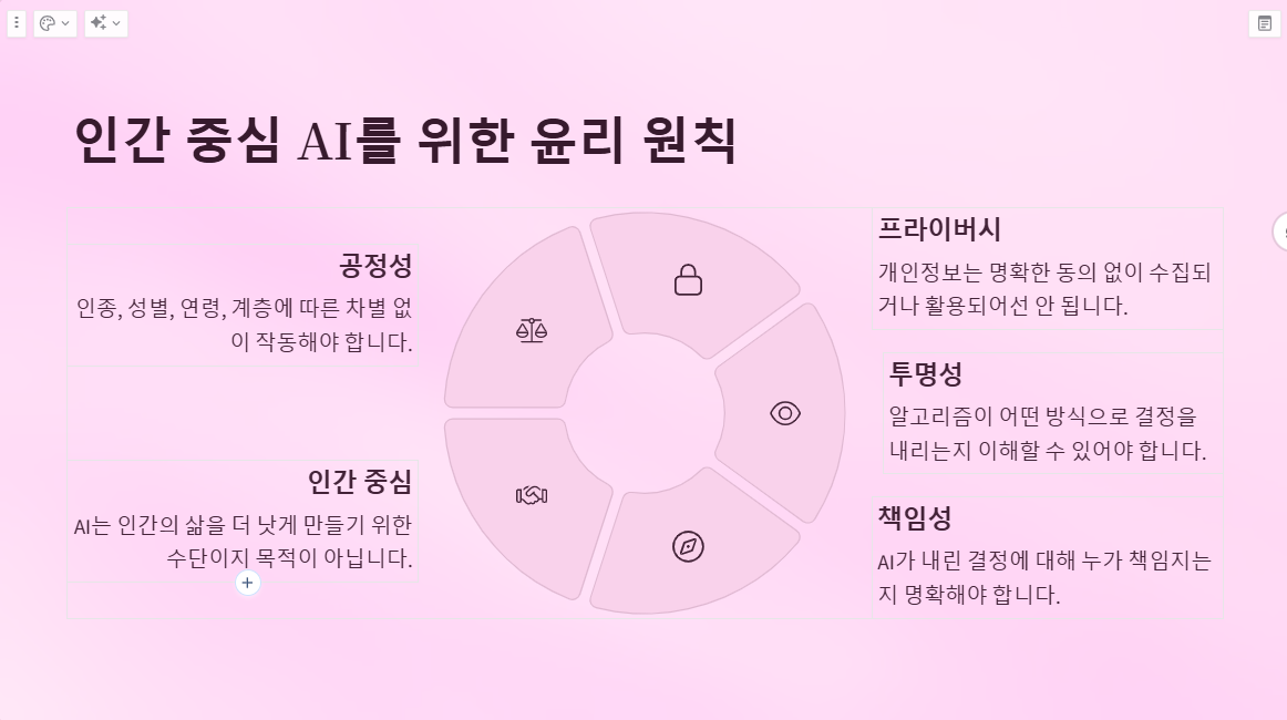 - 🤝 인간 중심(Human-Centric) – AI는 인간의 삶을 더 낫게 만들기 위한 수단이지 목적이 아닙니다. 인간의 통제를 벗어나지 않는 선에서 사용되어야 하며, 궁극적으로 인간의 권리를 보장해야 합니다.